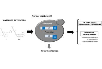 As caspases 3 e 7 desempenham um papel fundamental na ativação da apoptose e por conseguinte a procura de ativadores destas protéases tem merecido particular atenção na pesquisa de fármacos com efeito antineoplásico. Este trabalho descreve a implementação de um sistema de pesquisa de ativadores destas caspases humanas tendo como base a levedura, um organismo unicelular eucariota, como modelo celular simplificado para a pesquisa em larga escala. Usando esta abordagem identificaram-se dois potenciais novos activadores da caspase-7, que não interferiam com a atividade da caspase-3 na levedura. A actividade destes compostos foi ainda confirmada em duas linhas celulares tumorais humanas.